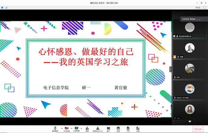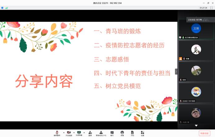 第二部分由研究生代表黄官骏,本科生代表杨孝彬、张文博为同学们分享抗疫故事。黄官骏同学主要和学弟学妹分享了在英国交流学习的感受以及在疫情期间辗转回国的经历,他深刻体会到国内外抗击疫情的差别,怀揣一颗感恩之心感谢祖国母亲及yl6809永利集团领导和老师给予他的关心和照顾;杨孝彬同学讲述了同村官母亲一起抗疫的故事,在抗议中领会到共产党员的使命与担当;张文博同学则在疫情暴发以来始终心系第二故乡湖北,并报名参加了当地中心医院的志愿服务,他说作为当代青年就要努力学习、帮困扶难、踏实朴实、引领带头。