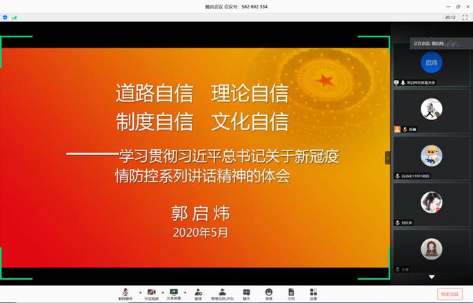 会议由辅导员张鑫主持,第一部分党委副书记郭启炜带领全体参会学生重温习近平总书记关于新冠疫情防控的重要论述和指示批示精神,用事例的方式讲解“四个自信”,再这次党课上他指出此次抗击疫情充分彰显了以人民为中心的发展思想,道路自信是历史的选择、人民的选择,理论自信推动实践发展 ,制度自信的关键在于中国共产党的领导和中国特色社会主义制度优势 ,文化自信事关国运兴衰、事关文化安全、事关民族精神独立性。
