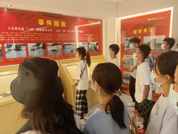 随着讲解员讲解的不断深入,一幅幅画面展现在我们眼前,仿佛可以看见十几年前的那个夜晚,我校十几名大学生在长江边义无反顾下水勇救落水儿童的情景。同学们手拉手形成一条人链去拯救两条幼小的生命,最终人救了上来,三名大学生却不幸牺牲。讲解员讲到此处,一时间纪念馆里氛围格外的沉重。