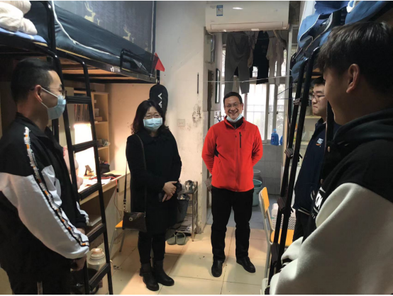 走访过程中,院领导亲切地与同学们交流关于学校疫情防控措施的适应情况,就校园封闭式管理期间的线上学习、宿舍生活、就餐问题等方面与同学们进行了深入交谈。刘逸书记简明地向大家传达了学校的疫情防控政策,嘱咐同学们在此特殊时期要严格遵守规定,并希望大家对学校的政策给予充分的理解和支持;副书记郭启炜则希望大家及时反馈学习和生活中遇到的困难,积极调整心态,安心学习。
