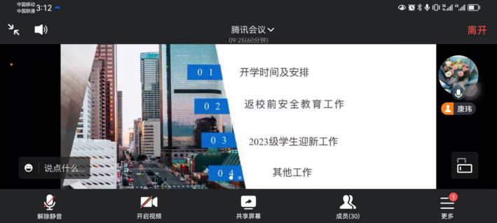 9月25日晚上8点,为了引导和教育新生更快更好地融入新阶段的学习和生活,我院召开了2023级研究生新生入学教育,本次会议线上举行。出席本次班会的有辅导员康玮,2022级研究生学长尚玉豪以及全体2023级研究生新生。会议由尚玉豪主持。