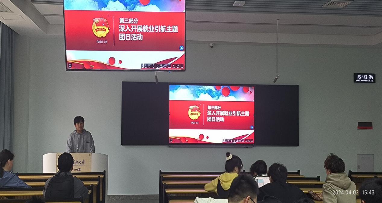 人工智能12201团支部于4月2日下午在16教B106开展三月班团会。团支书南林江带领同学们学习以“学习新思想,做好接班人”为主题的团课,深入学习党的二十大关于全面建成社会主义现代化强国、以中国式现代化全面推进中华民族伟大复兴的战略部署,学习了解新时代新征程党和国家事业发展的目标任务,引导青年学生积极成为环境保护的志愿者、实践者和环保行动的宣传者和推动者。最后鼓励班级的每一位同学围绕学习主题,结合实际开展力所能及的志愿活动。