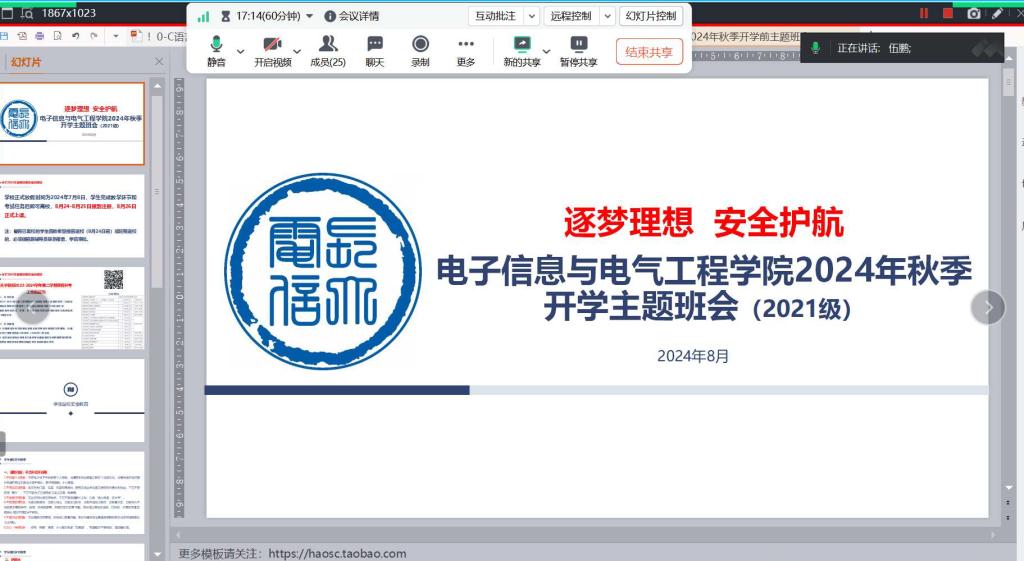 本次班会主要围绕以下四个方面开展:一是针对老生传达新学期教育教学事项,包括返校时间安排以及学费缴纳等;二是返校前安全教育;三是开展网络文明建设教育;四是针对2024级新生,讲解线上报到流程及注意事项等内容。