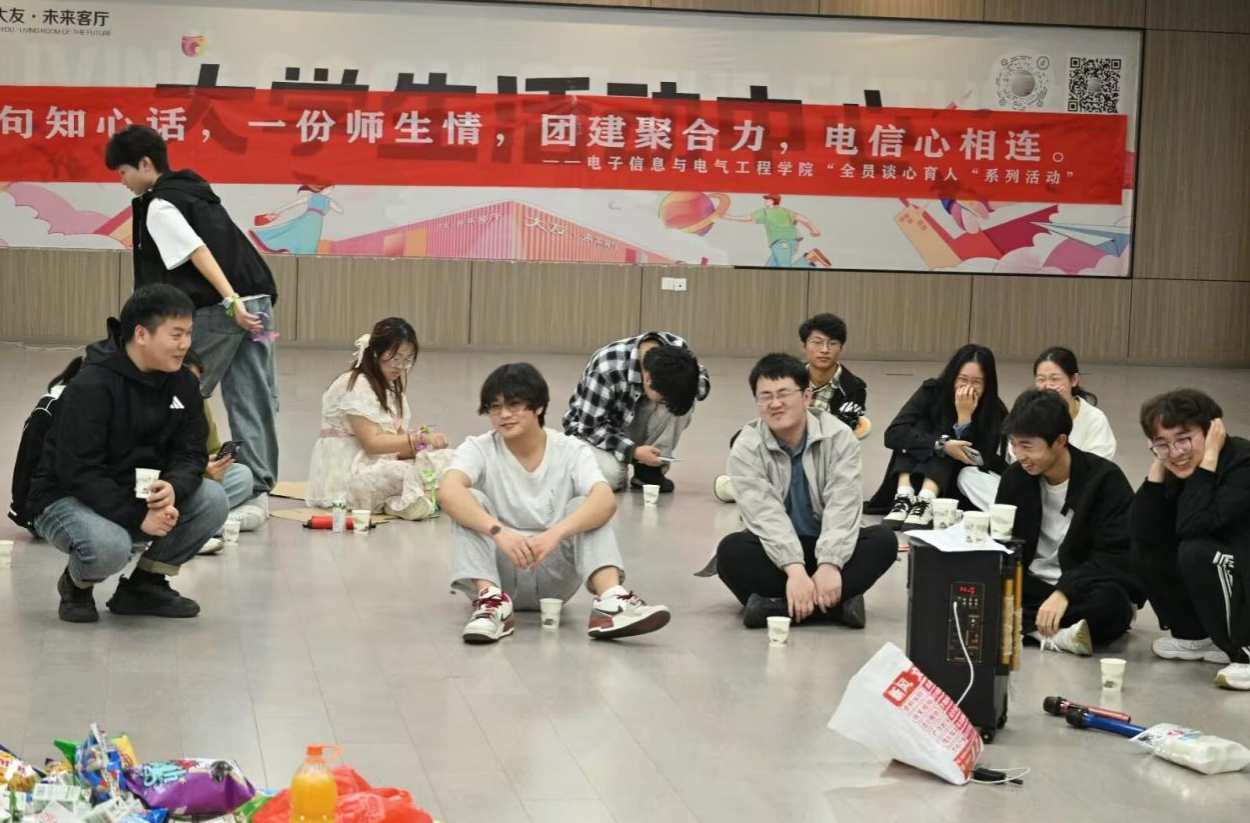(通讯员 袁成雅/文 陶旭日/摄)为深入推进“全员谈心育人”工作,搭建师生面对面交流平台,凝聚育人合力, 4 月 11 日下午,电信学院在东校区未来客厅二楼温情开展“一句知心话,一份师生情,团建聚合力,电信心相连”活动。学院党委副书记张晨露,辅导员颜国琼、康玮、沈马锐、李蒙、邓兴勇等六位老师与学院学生代表欢聚一堂,以茶话会为纽带,谈心交流、互动游戏、共话成长,在轻松温馨的氛围中传递关怀、凝聚温情。