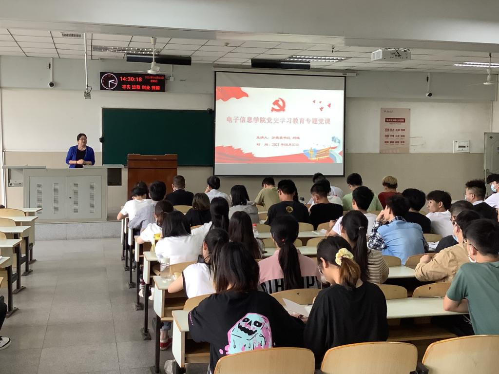 2021年6月3日,电子信息学院党史学习教育专题党课在12教102举行,本次党课由分党委书记刘逸主讲,由分党委副书记郭启炜主持,全体学生党员参加。