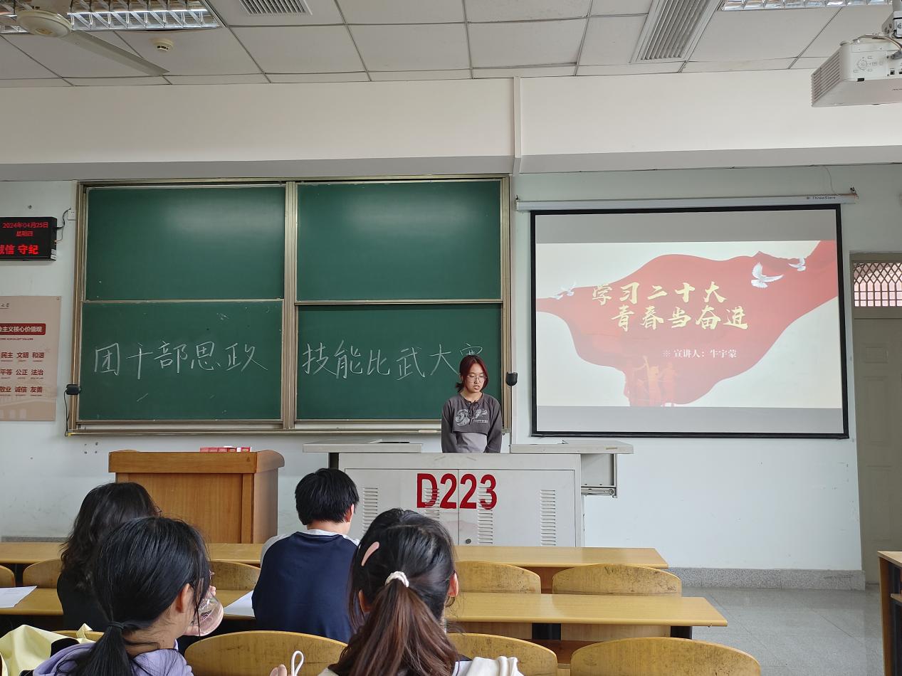 本次基层团干部专项赛要求2022级、2023级各班团支部派一名及以上学生干部参加,2020级和2021级各班团支部自愿报名参加。本次竞赛包含理论知识竞赛和主题团课展示两部分,其中理论知识竞赛为线下闭卷答题,题型包括选择题、填空题;主题团课展示要求参赛选手依据《团干部思政技能大比武主题团课备赛指南》,紧扣“学习贯彻党的二十大精神”主题,以PPT形式展示一节主题团课。两部分各占总成绩的50%,最后电信类12302班牛宇蒙同学以9.4分的综合成绩获得本次基层团干部思政技能大比武的第一名。