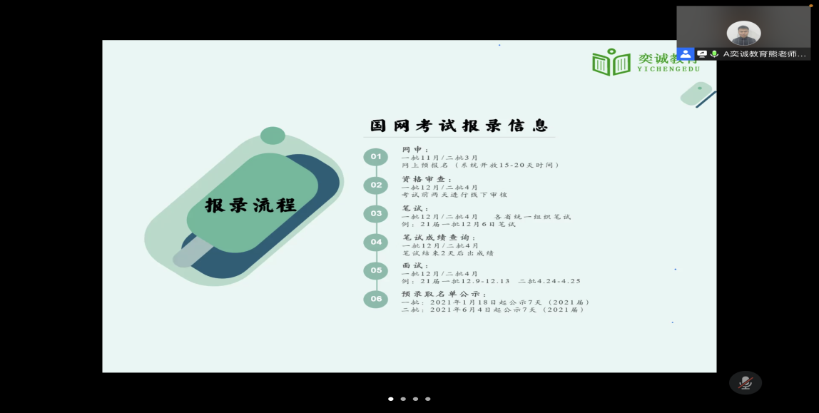 (通讯员 赵宇)为促进我院毕业生的就业和未来职业规划发展,为同学们提供专业的就业指导,学院于12月5日晚20:00通过线上腾讯会议的方式开展了“国网考试——你不知道的秘密”国家电网备考攻略主题讲座,本次讲座邀请了来自奕诚教育具有丰富的国考培训教育经验的熊军老师担任此次会议的主讲人,19级、20级电气专业学生参加此次主题讲座。