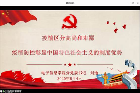 2020年6月4日晚19点30分,电信学院召开了《讲好抗议故事,增强“四个意识”、坚定“四个自信”、做到“两个维护”》线上交流会。会议由学院分党委副书记郭启炜主持,分党委书记刘逸、辅导员艾林、毕业年级全体学生党员和电气11601班全体学生参加了会议。