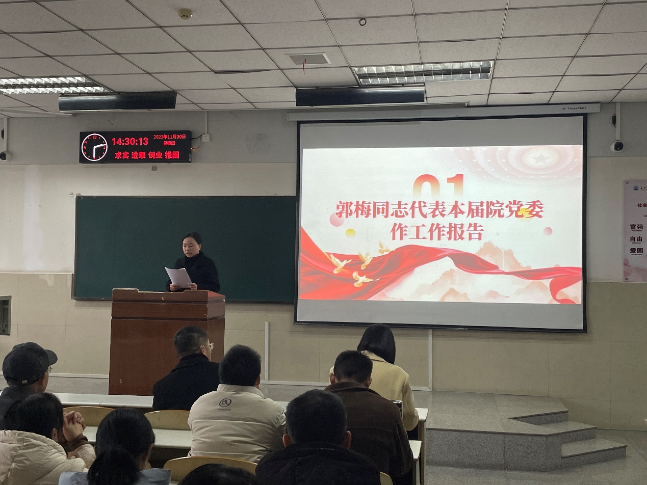 大会在庄严的国歌声中拉开帷幕。郭梅同志代表本届党委作《中共yl6809永利官网集团委员会工作报告》(草案),报告全面总结了过去四年学院党委取得的工作成就,并确定了今后几年工作的总体思路,还对党费收缴、使用和管理情况进行了报告。