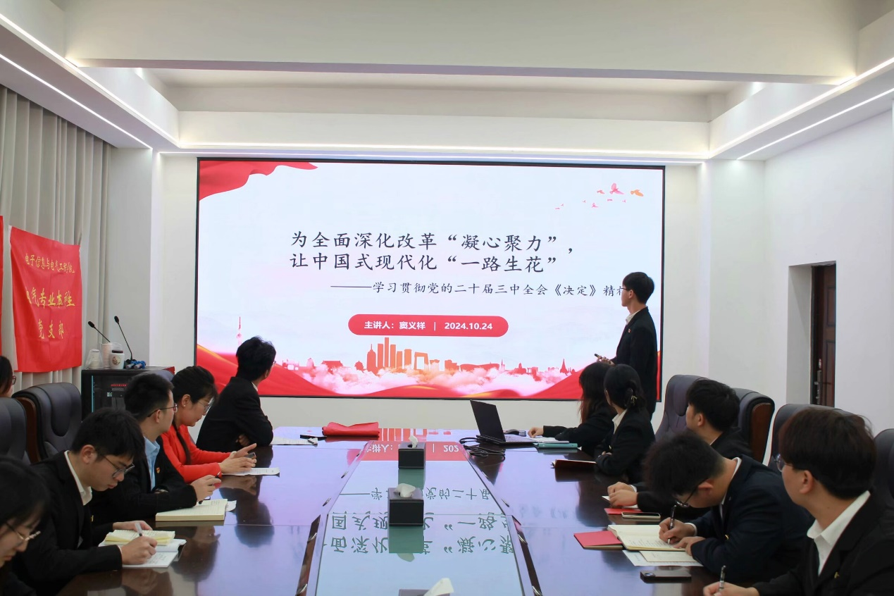 电气专业本科生党支部窦义祥同学结合《决定》文件,讲授了以“为全面深化改革‘凝心聚力’让中国式现代化‘一路生花’”为主题的微党课,从中国式现代化、进一步全面深化改革、以人民为中心和党的领导四个角度叙述了进一步全面深化改革,推进中国式现代化的前进方向和重要意义,号召党员同志积极学习贯彻党的二十届三中全会精神。