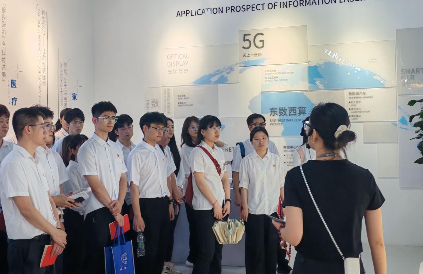 在激光科技馆,院长罗明璋以“新时代电子信息产业的机遇与挑战”为题现场为同学们讲授思政课。他立足国家战略规划部署,解读了高端装备制造、激光技术等领域的政策导向,强调“核心技术自主可控”的紧迫性;通过分析全球产业智能化、绿色化转型趋势,特别指出武汉光谷的产业集群优势为高校人才提供了广阔舞台。