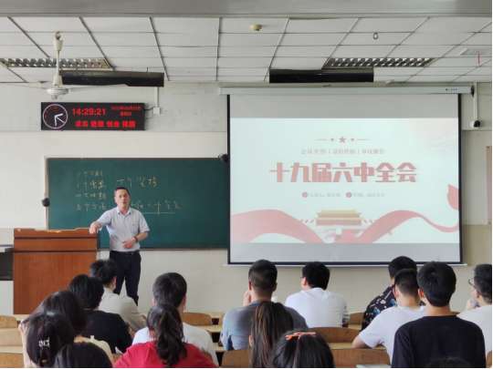 (通讯员 夏子阳)5月5日下午,电信学院在12教202举行学习贯彻党的十九届六中全会精神专题报告会。报告会由院分党委副书记郭启炜主讲,全体学生党员参加。
