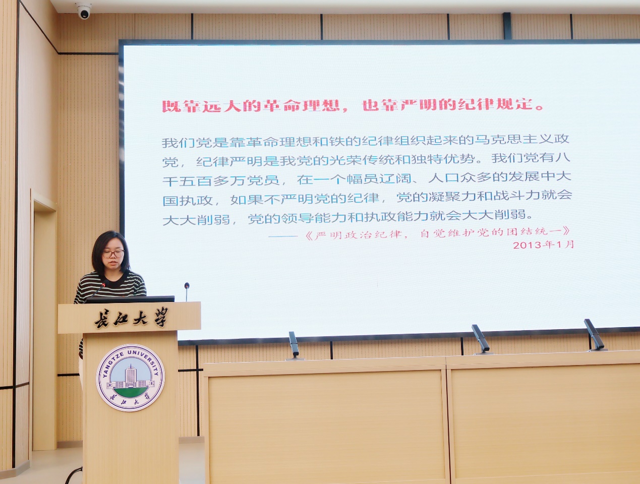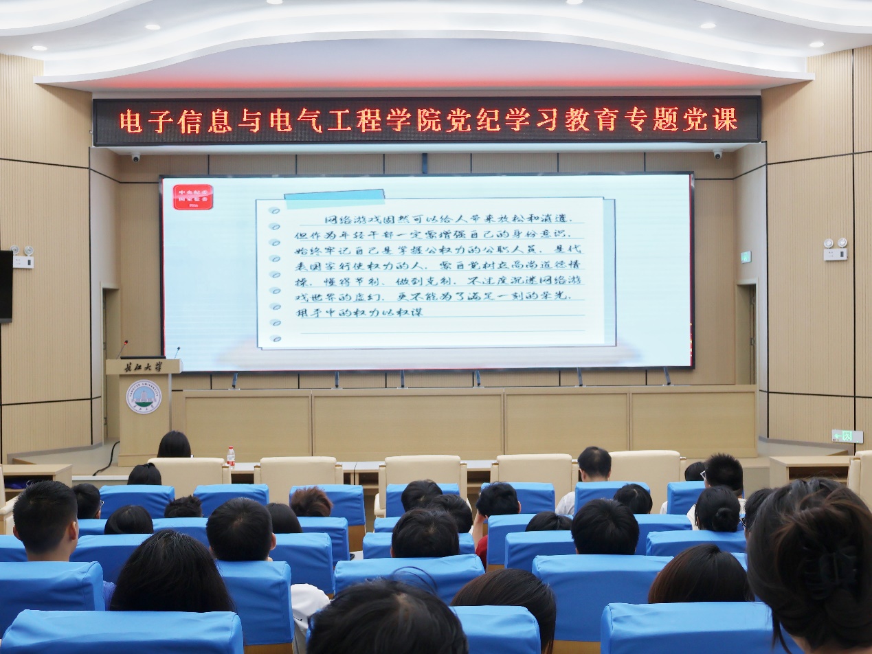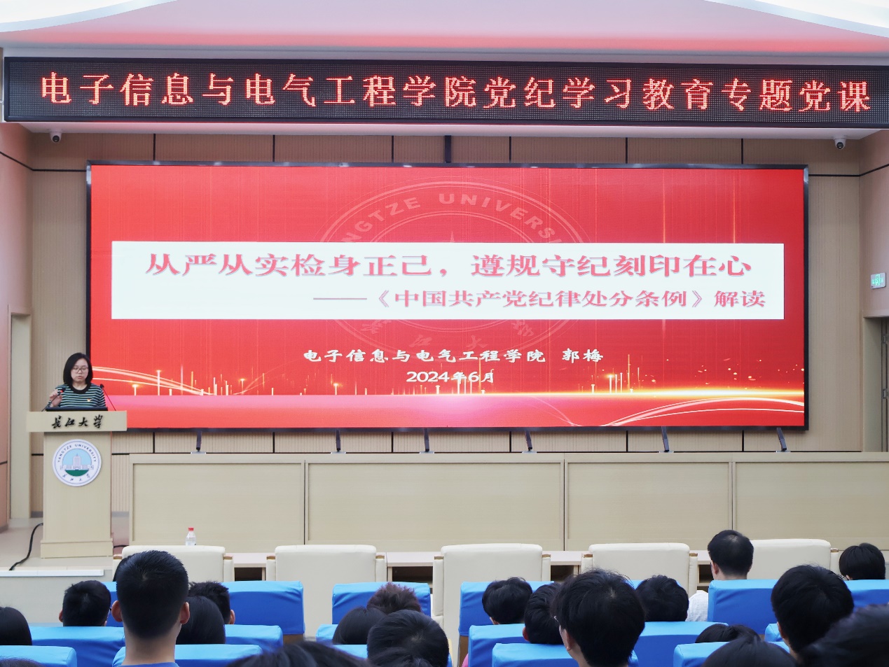 为推进党纪学习教育走深走实,切实增强全体党员的纪律意识和规矩意识,6月13日晚,学院党委书记郭梅以《从严从实检身正己 遵规守纪刻印在心》为题为全院学生党员讲授了党纪学习教育专题党课,深入解读《中国共产党纪律处分条例》。