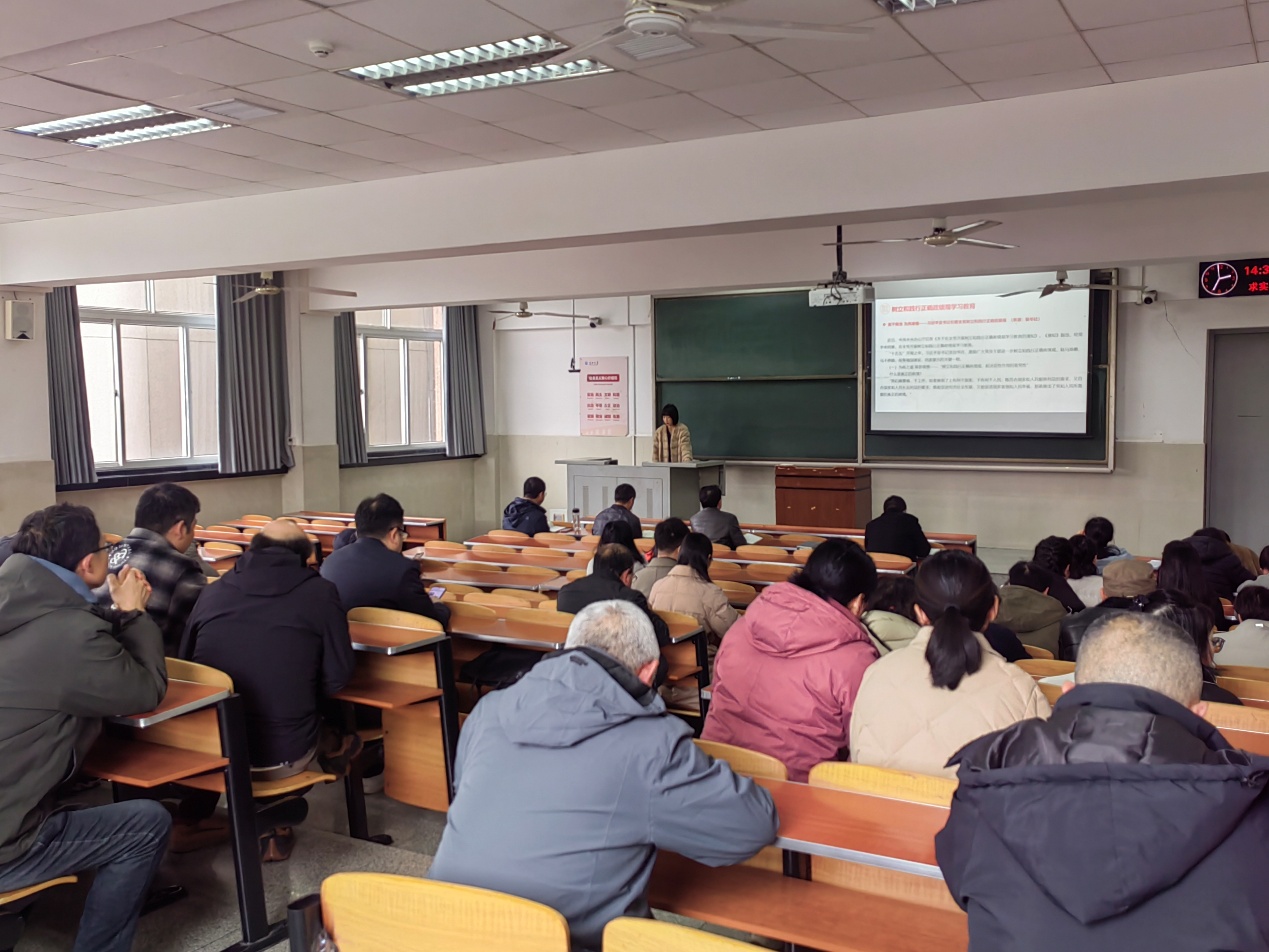3月5日下午,学院召开教职工大会,会上开展政治理论学习。学院党委副书记张晨露带领全体教职工集中学习了习近平总书记在二〇二六年春节团拜会上的重要讲话、习近平总书记在二十届中央纪委五次全会上的重要讲话、习近平总书记关于国家自然科学基金委员会工作的重要指示以及习近平总书记在省部级主要领导干部学习贯彻党的二十届四中全会精神专题研讨班开班式上的重要讲话,还传达学习了中央党的建设工作领导小组关于研究部署树立和践行正确政绩观学习教育工作会议精神、省委常委(扩大)会议精神、校党委有关会议精神,还学习了中共中央办公厅印发《关于在全党开展树立和践行正确政绩观学习教育的通知》,以及《求是》杂志发表的习近平总书记重要文章《让愿担当、敢担当、善担当蔚然成风》等内容。