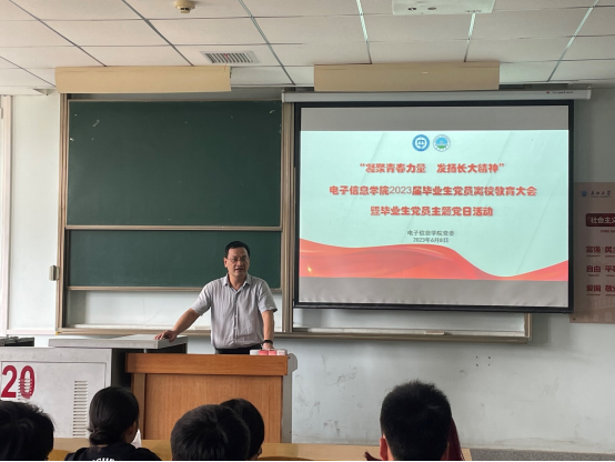 为深入推进学习贯彻习近平新时代中国特色社会主义思想主题教育,引导广大党员坚持以习近平新时代中国特色社会主义思想为指导,深入学习贯彻落实党的二十大精神,加强毕业生党员的理想信念教育、爱国爱校教育,激发毕业生党员的使命担当,68日下午,电子信息学院在13C220组织毕业生党员开展以“凝聚青春力量 发扬长大精神”为主题的离校教育大会暨主题党日活动。学院党委副书记郭启炜、党建秘书李蒙、在校毕业生党员参加会议。