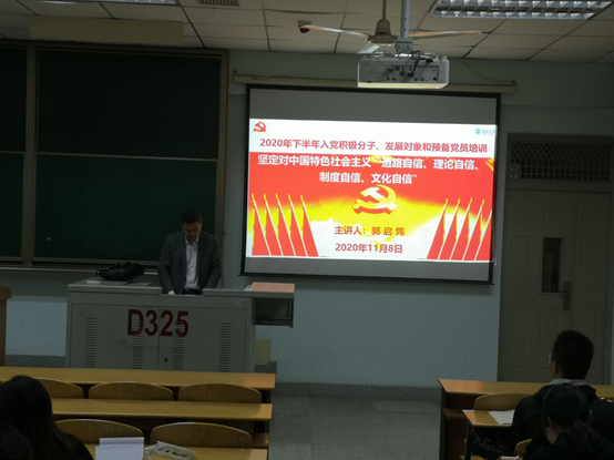 11月8日晚7:00,电信学院党委副书记郭启炜以坚定对中国特色社会主义“道路自信、理论自信、制度自信、文化自信”为题,为2020年下半年入党积极分子、发展对象和预备党员讲专题党课。