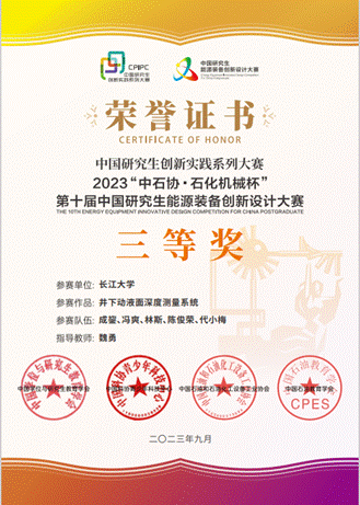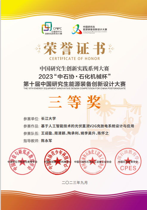 由陈永军教授指导的作品《基于⼈⼯智能技术的光伏直流V2G充放电系统设计与应⽤》和魏勇教授指导的作品《井下动液面深度测量系统》均获得国家级三等奖。