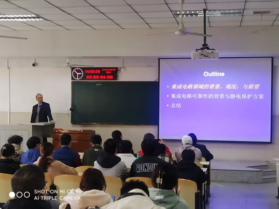 刘教授用轻松幽默的语言开场,围绕快乐和成功,引导大家深入思考,激发同学们的学术热情,并对同学们提出了积极的人生建议。讲座中,刘教授从集成电路产业发展切入,分别从产业概况、关键技术和研发状况等方面讲述了国内外集成电路的历史、现状及展望。他指出了国内集成电路发展中存在的历史差距以及需要面对的技术瓶颈。刘教授鼓舞同学们不仅要夯实专业基础,还要有前瞻性地去主动学习相关知识。在此基础上,刘教授深入浅出地阐述了影响芯片可靠性的多种因素:以静电防护为例详细介绍了片上ESD电路的工作机理和设计方法,并结合FinFET、纳米线晶体管、化合物半导体等先进集成电路器件与材料的实际案例,说明开展集成电路研究的方法。在讲座最后的讨论环节,同学们踊跃向刘教授请教相关问题,刘教授一一作了细致解答。同学们一致认为刘教授的报告内容充实,让人受益匪浅。