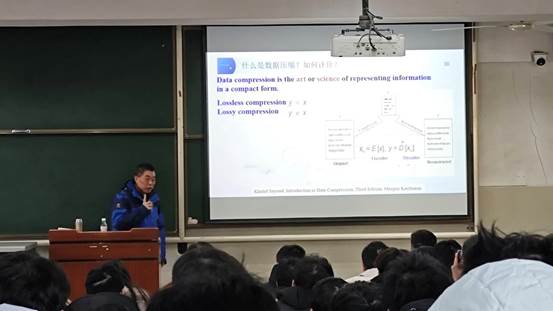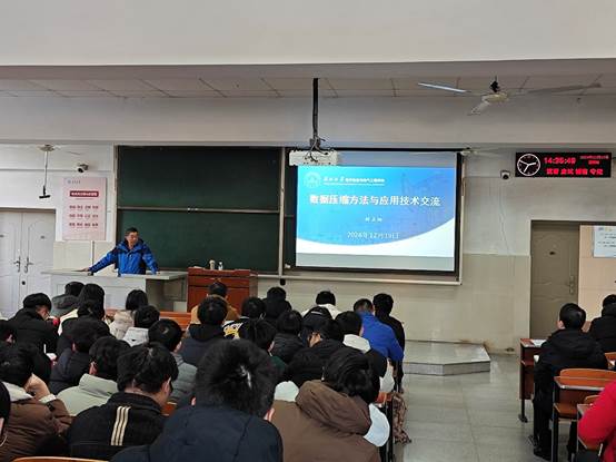 张教授的报告题目为《数据压缩方法与应用技术交流》。会上,张教授从人们在工作、生活、学习过程中需要经常回答的5个问题“干啥?为啥?成否?怎干?怎样?”入手,以回答这些问题的方式介绍了数据压缩的概念、意义、评价指标、常用的无损压缩方法和常用的有损压缩方法。通过分析对海绵、篮球、实心铅球等物体进行压缩的可能性,可知能被有效压缩的数据中必须存在一种或多种类型的冗余。张教授从世上没有包治疗百病的万能药,治病必须对症下药的道理出发,将数据中的冗余比作病,将冗余的类型及多少比作症,将数据压缩算法比作治病的药,认为数据压缩应该使用对症的算法(药),尽可能地消除或减少数据中的冗余(治病),从而实现高倍压缩而不影响正常使用。最后,他通过应用实例介绍了随钻测井数据压缩、地震勘探数据压缩、超声电视成像测井图像压缩等方法与应用技术。