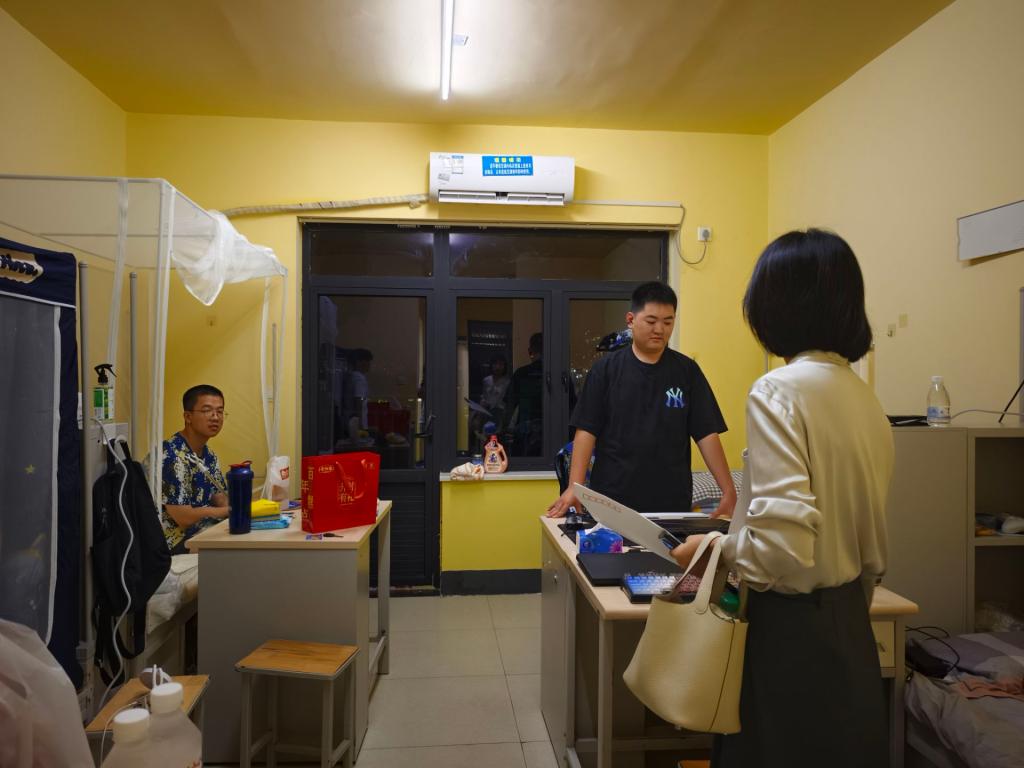 班会结束后,学院领导、班主任以及辅导员一行深入新生宿舍,走访慰问刚刚安顿下来的新同学。“家乡是哪里的?”“对学校的饮食和住宿还习惯吗?”“生活上有没有什么困难?”每到一个寝室,领导老师们都与新生进行亲切交谈,细致地了解他们的入住情况和生活需求,耐心解答同学们的各种问题,并叮嘱大家要尽快适应新环境,团结室友,注意人身和财产安全,以饱满的精神状态迎接接下来的军事训练和大学课程学习。亲切的问候和暖心的话语让新生们倍感温暖,纷纷感谢学院的关心。