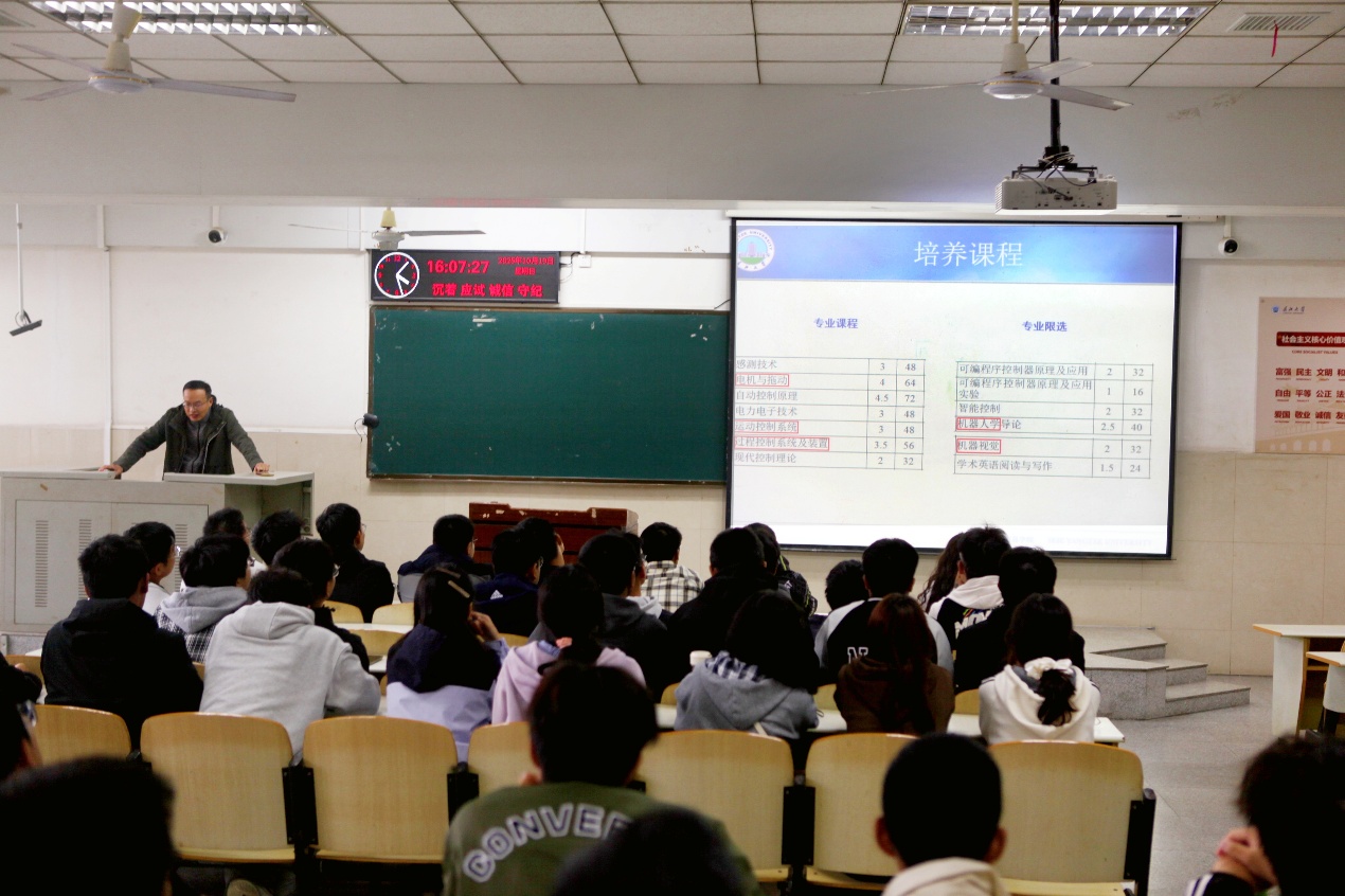 “我们的专业,不仅教你知识,更赋予你改变世界的能力。”在阐述“专业特色与知识体系”时,魏老师用一系列生动和真实的案例,将复杂的专业体系转化为新生能读懂弄通的简单概念,让同学们对自己的专业有了基本的认知。最后,他从“未来发展与愿景展望”的角度将全场气氛推向高潮,他鼓励新生们“先开枪,后瞄准”,强调了强大执行力的重要作用,期望同学们敢于拼搏,直面困难,赢得了阵阵热烈的掌声。