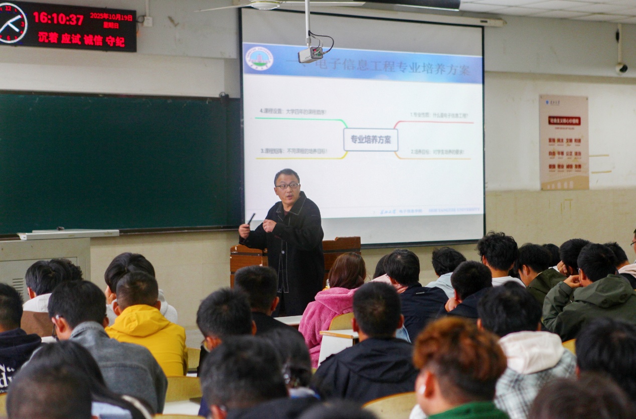 报告厅内,新生们目光炯炯,充满期待。魏老师从汹涌澎湃的“时代浪潮与专业使命”讲起,将人工智能、集成电路等前沿领域与国家战略需求紧密相连,点燃了同学们心中的责任与豪情。紧接着,他如数家珍般地介绍了学院的辉煌历史和雄厚的办学实力,一幅清晰的学院发展脉络图谱展现在大家眼前。