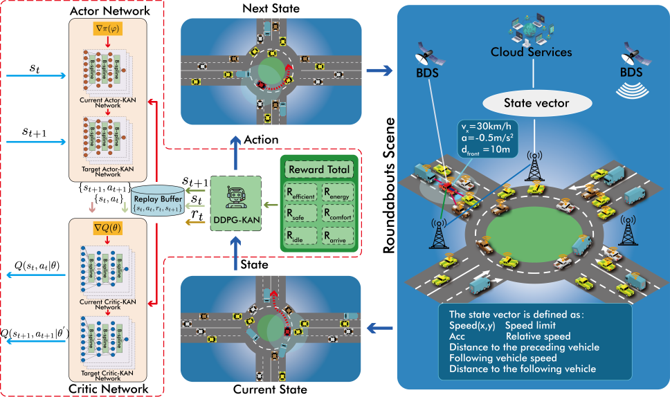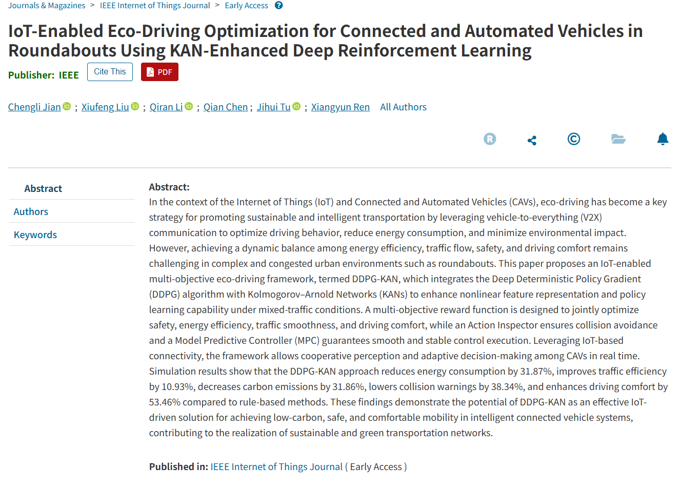 近日,电子信息与电气工程学院数智融合理论及应用研究团队在智能网联汽车生态驾驶优化领域取得重要进展,相关研究成果在国际物联网领域顶级期刊《IEEE Internet of Things Journal》(IEEE IoT)录用并正式发表。论文题为《IoT-Enabled Eco-Driving Optimization for Connected and Automated Vehicles in Roundabouts Using KAN-Enhanced Deep Reinforcement Learning》,论文第一作者为电信学院2023级研究生简成利,通讯作者为涂继辉老师,yl6809永利集团为第一署名单位。