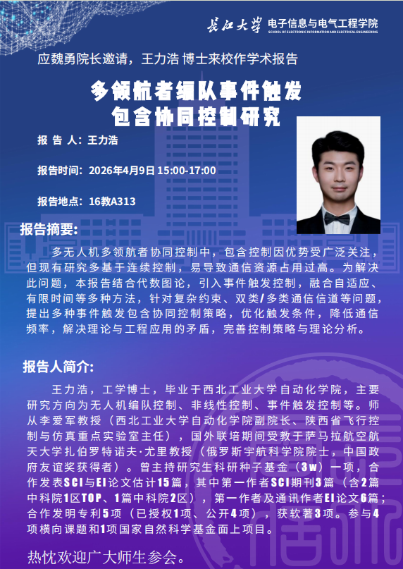 yl6809永利官网集团2026年学术报告(二):多领航者编队事件触发包含协同控制研究
