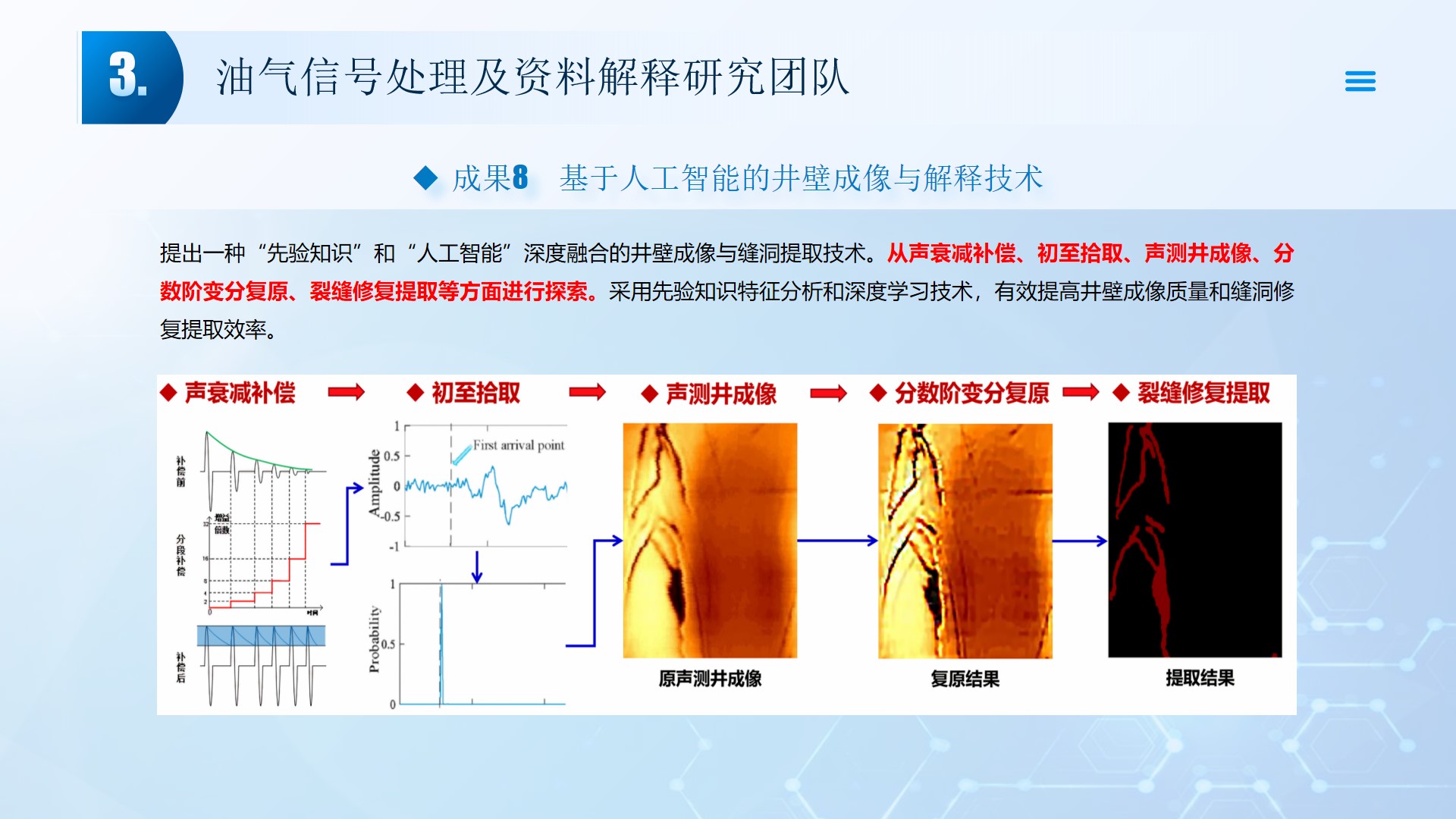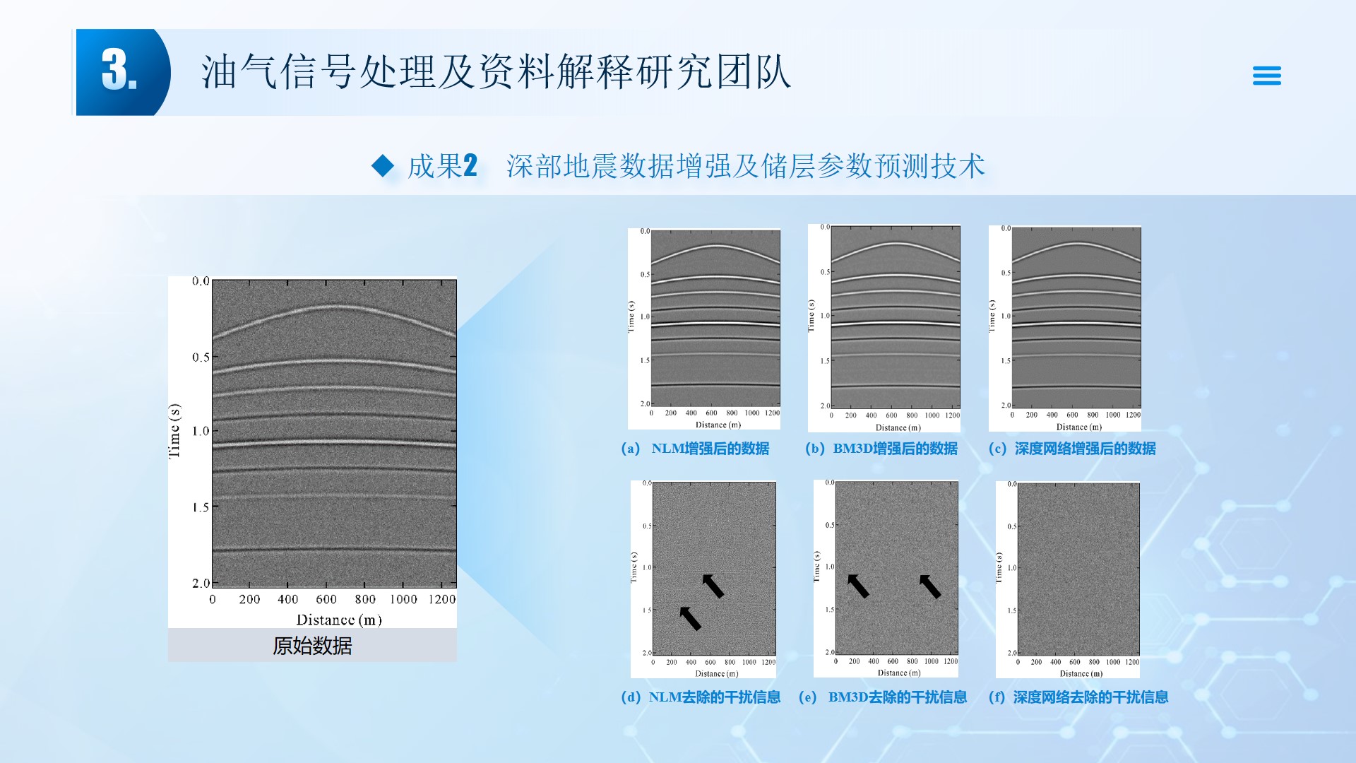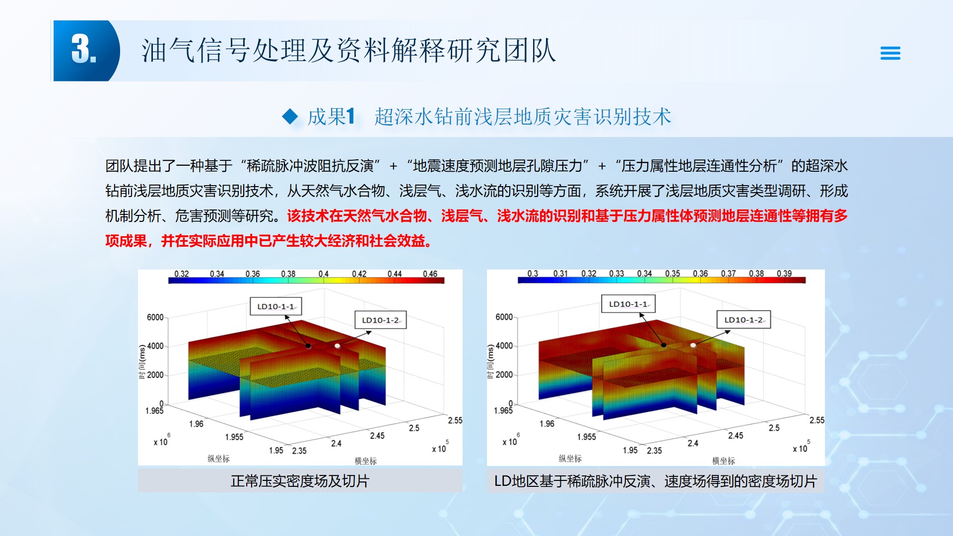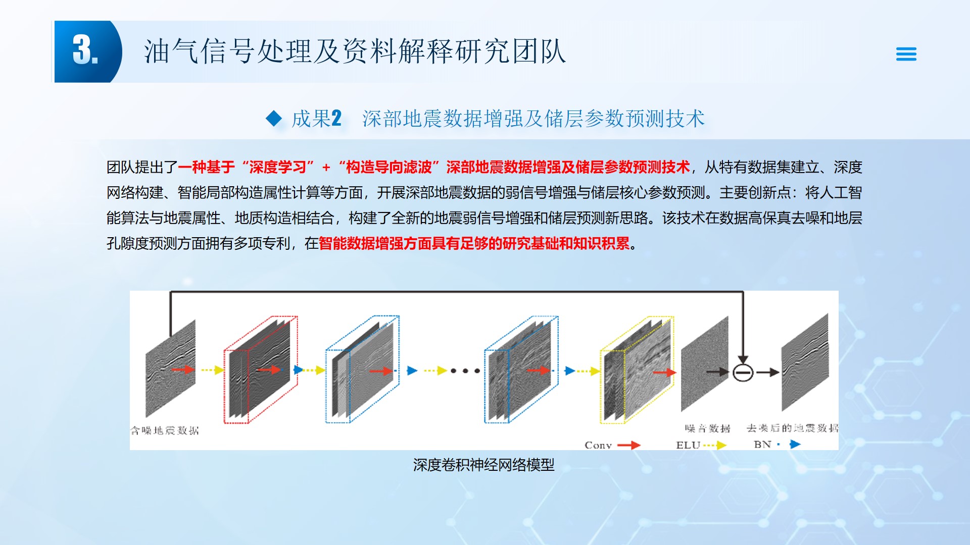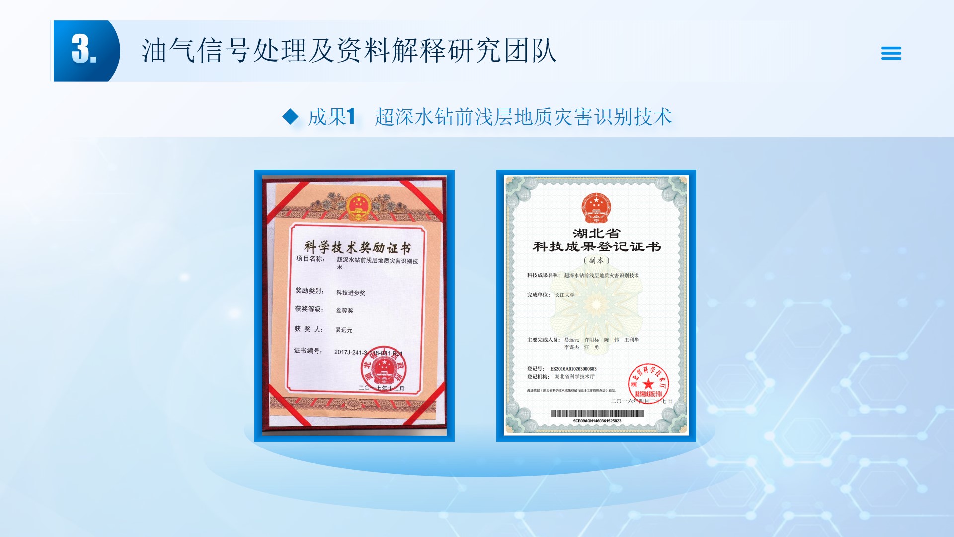 团队长期从事地震资料解释、深水浅层地质灾害钻前预测、地质工程一体化应用等方向的研究。先后主持或参与国家自然科学基金面上项目2项,承担国家科技重大专项4项,省部级及油田委托项目《基于GPU的海量地震数据并行可视化技术研究》、《华北油田地震反射弱信号储层预测技术方法研究》、《云平台下的智慧农业系统》等其他各类科研项目100余项。出版学术专著和教材10部,先后在《IEEE Access》、《IET Image Processing》、《IET Biometrics》、《IET Signal Processing》、《Electronics Letters》、《Sensors》、《计算机应用》等国内外主要学术刊物上公开发表学术论文200余篇。授权国家发明专利20件、实用新型专利8件、软件著作权15件,获得各类科技进步奖励5项。 指导国家级大学生创新与创业项目5项,连续3年入选国创年会(2019-2021),3项被评为优秀。指导研究生和本科生参加挑战杯和互联网+大赛获奖5项,其中包括国赛铜奖2项,省一等奖2项,省二等奖3项。