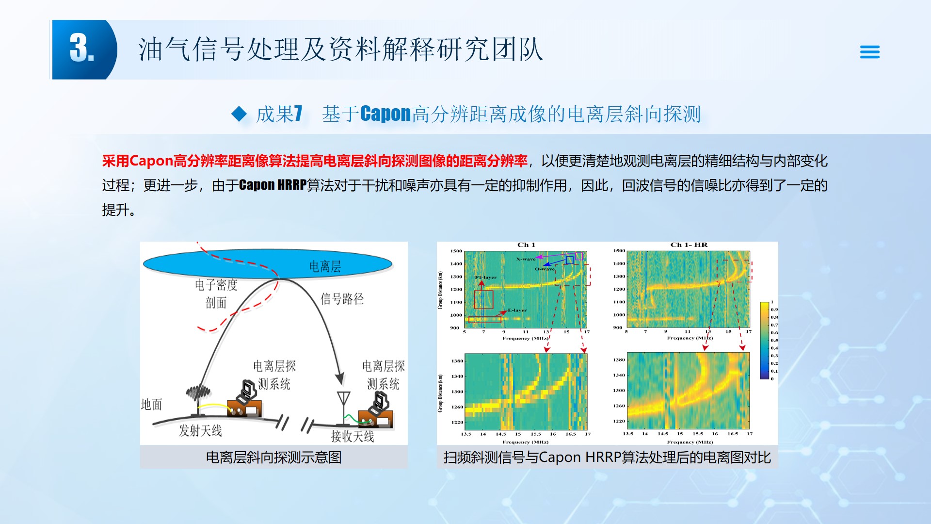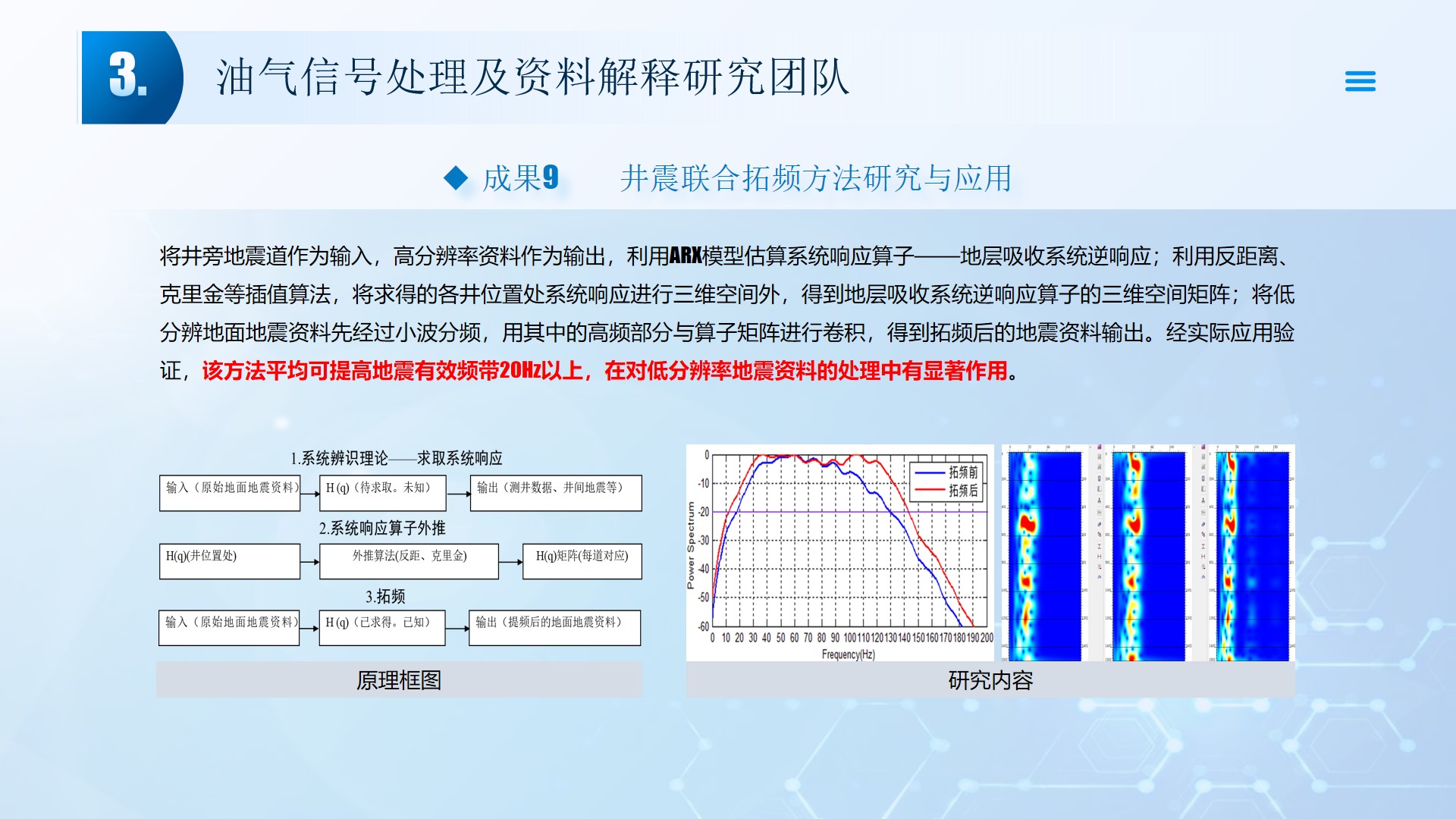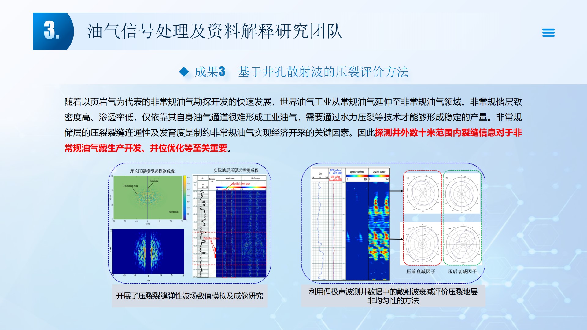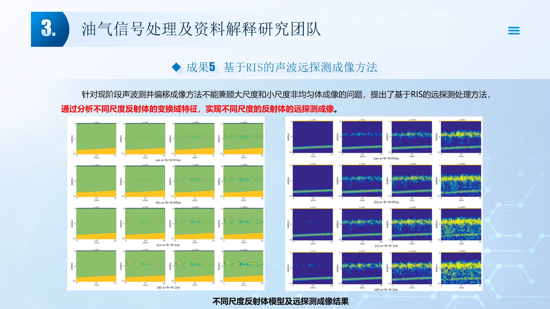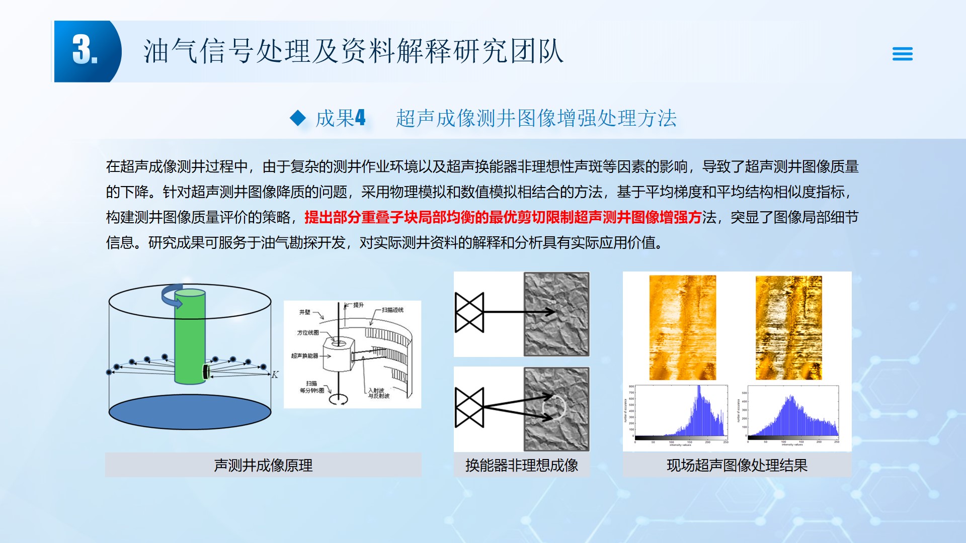 团队长期从事地震资料解释、深水浅层地质灾害钻前预测、地质工程一体化应用等方向的研究。先后主持或参与国家自然科学基金面上项目2项,承担国家科技重大专项4项,省部级及油田委托项目《基于GPU的海量地震数据并行可视化技术研究》、《华北油田地震反射弱信号储层预测技术方法研究》、《云平台下的智慧农业系统》等其他各类科研项目100余项。出版学术专著和教材10部,先后在《IEEE Access》、《IET Image Processing》、《IET Biometrics》、《IET Signal Processing》、《Electronics Letters》、《Sensors》、《计算机应用》等国内外主要学术刊物上公开发表学术论文200余篇。授权国家发明专利20件、实用新型专利8件、软件著作权15件,获得各类科技进步奖励5项。 指导国家级大学生创新与创业项目5项,连续3年入选国创年会(2019-2021),3项被评为优秀。指导研究生和本科生参加挑战杯和互联网+大赛获奖5项,其中包括国赛铜奖2项,省一等奖2项,省二等奖3项。